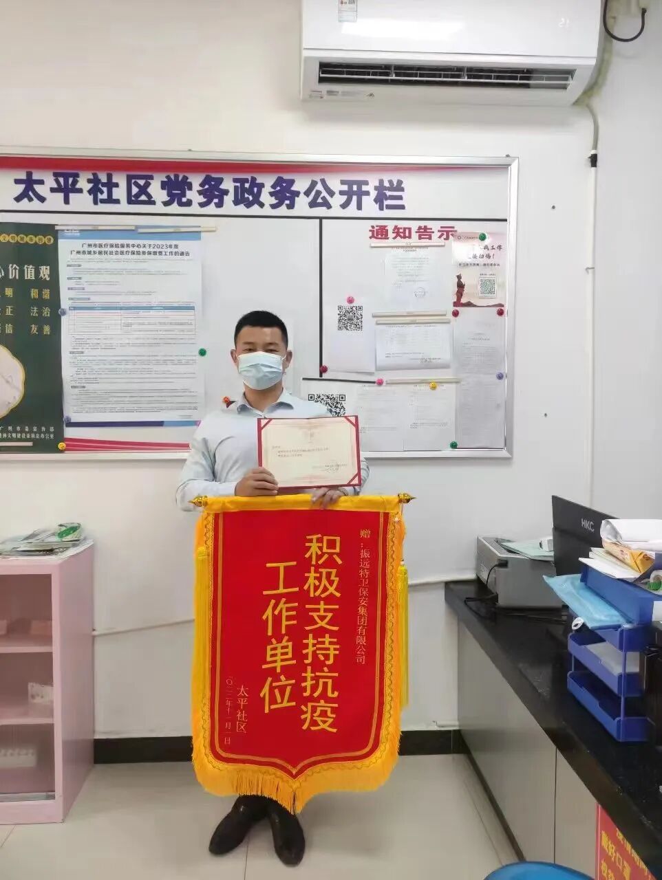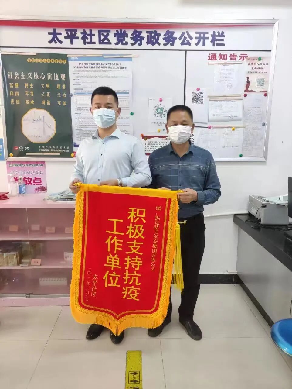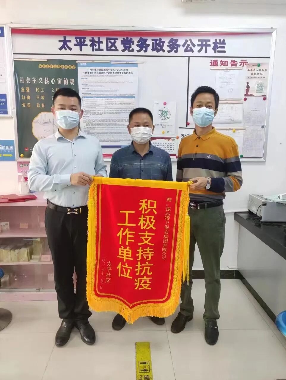 国内各地疫情呈多点散发趋势,防控形势愈加严峻。振远特卫人员积极支援社区疫情防控工作,本着把保安使命责任“担”起来,把志愿服务精神“扬”起来的宗旨以及振远特卫的志愿精神和服务精神,为协助社区工作人员进行消杀、分拣搬运物资、分发登记快递、协助维护核酸检测秩序,有条不紊地完成每项工作、每个流程,11月1日太平社区向振远特卫集团赠送‘积极支持抗疫工作单位’的锦旗,事故无情人有情,助人为乐显真情,振远特卫人员积极发挥先锋模范作用,坚持战斗在疫情防控第一线,以实际行动为打赢这场抗“疫”战贡献力量。