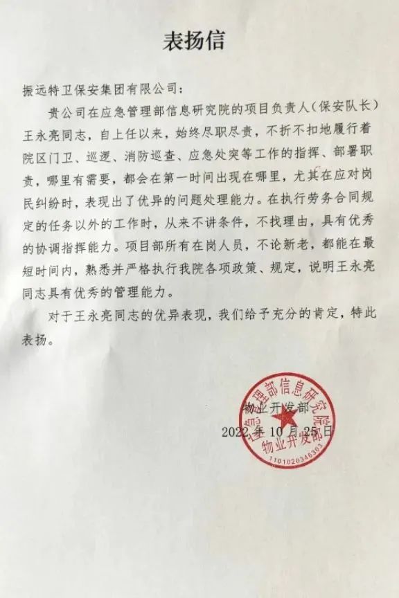 近日,振远特卫保安集团有限公司获得应急管理部信息研究院客户单位的好评,对我公司项目负责人的优良工作作风和尽职尽责的工作态度进行高度肯定和赞扬。 公司为了感谢保安员在岗位上的辛勤付出,特意写了表扬信给予表扬此项目负责人振远特卫王永亮同志,希望要继续立足本职,格尽职守,为客户单位提供更优质的服务! 时有所需,必有所为。虽然他们岗位平凡但是却一点也不平庸,在自己本职工作岗位上扎扎实实的做事,以积极的工作方式,健康的工作理念,务实求真的工作态度,用不平凡的业绩为企业赢得赞誉和实现自我的价值,诠释了作为普通人的伟大。表扬信,不仅是振远特卫安保工作的肯定,还是对振远特卫安保保安员一种强有力的鞭策! 振远特卫安保负责人表示,我们将树立先进模范,凝聚榜样力量,不断为客户提供优质、高效、专业的安全护卫服务,从心出发为客户单位经营生产安全保驾护航。